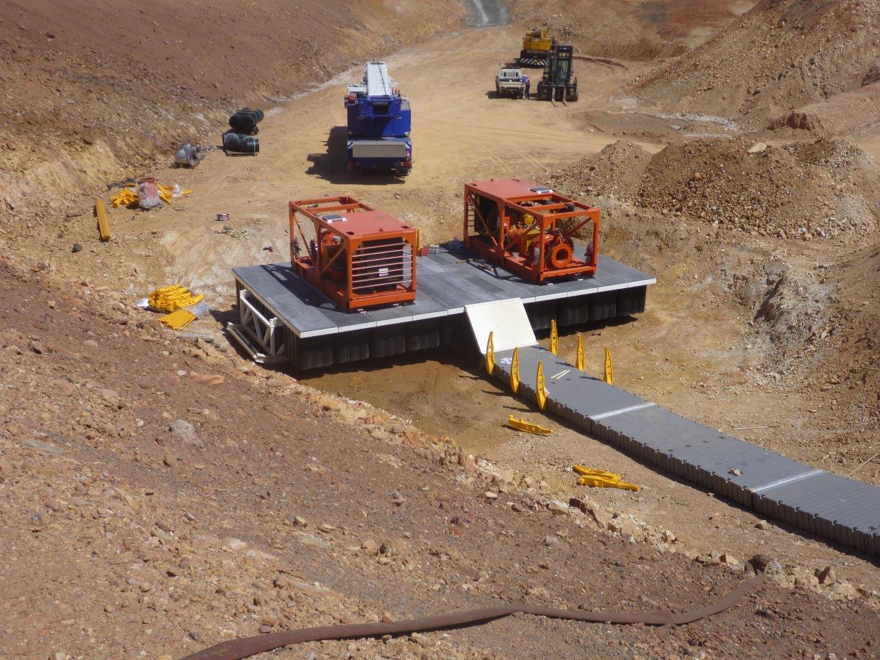 Two massive pump pontoons, each based on 20 foam filled modules were custom designed and built to suit Glencore’s requirements of holding a 12000kg staic load each with a 1.5 buoyancy.