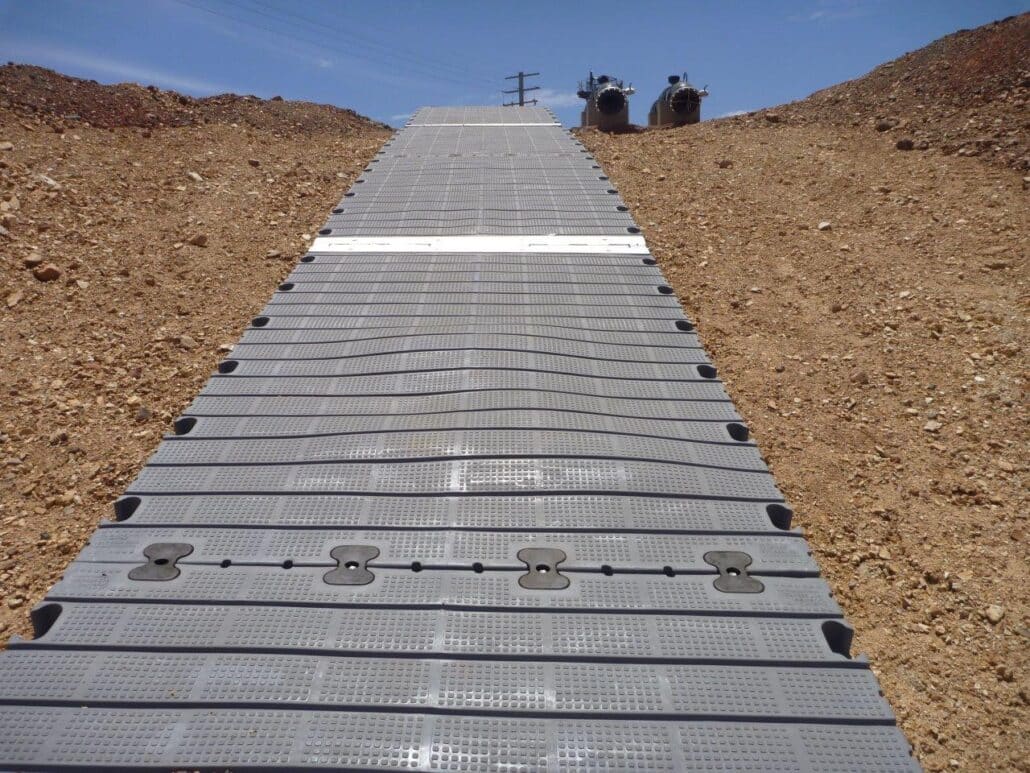 The 32m floating access walkway was built from the Superior Modular Docking range with the Edge I handrail system, including kickrails. Several pipe floats were also used for this tailings dam project.